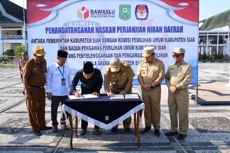 MafiNews.com, Siak - Pemerintah Kabupaten Siak bersama Komisi Pemilihan Umum (KPU) dan Badan Pengawasan Pemilihan Umum (Bawaslu) melakukan Penandatanganan Naskah Perjanjian Hibah Daerah (NPHD) secara serentak untuk Penyelenggaraan dan Pengawasan Pemilihan Kepala Daerah Kabupaten Siak.