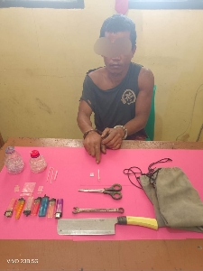 "Adapun Barang Bukti berupa Satu Kaca Pirek yang berisi narkotika jenis Sabu, Satu Paket Narkotika jenis Sabu yang terbungkus dengan Plastik Bening, Satu Tas yang didalamnya berisi Tujuh Mancis, Dua Bong yang terbuat dari Botol Air Mineral, Empat Plastik klip warna Bening, Satu Gunting dan Satu Pisau," kata Kapolsek.