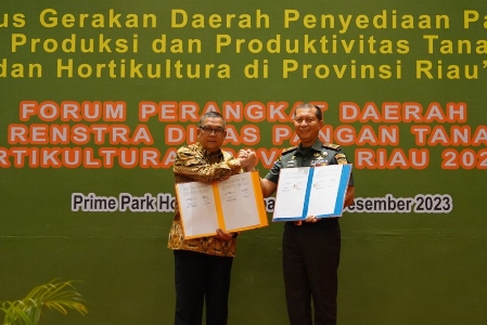 MoU tersebut diteken langsung oleh Gubernur Riau (Gubri) Edy Natar Nasution dan Danrem 031/WB, Brigjen TNI Dany Rakca Andalasawan dalam acara Rapat Koordinasi Akselerasi Penyediaan Pangan di Hotel Prime Park Pekanbaru, pada Kamis (7/12/2023).