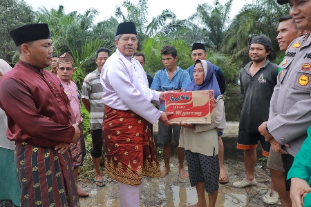 Temui warga kampung Teluk Lancang, kecamatan Sungai Mandau terdampak banjir musiman. Ada 14 KK warga terdampak banjir, mereka mendapat bantuan paket sembako dari Pemkab Siak.
