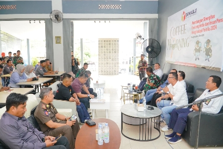 MafiNews.com, Bangkinang Kota - Badan Pengawas Pemilu (Bawaslu) Kabupaten Kampar bersama dengan Forum Koordinasi Pimpinan Daerah (Forkopimda) Kabupaten Kampar menggelar Coffe Morning bersama insan pers di Kabupaten Kampar di Kedai Kopi Tiga Pilar di Komplek Markas Kodim 0313 /KPR di Bangkinang Kota. Senin,11/02/24.