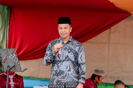 Asisten I Ahmad Yuzar memimpin acara pemberian Sembako kepada fakir miskin dan anak yatim piatu di Desa Pantai Raja Kecamatan Perhentian Raja.