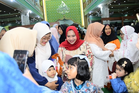 Bupati bergelar Kanjeng Mas Tumenggung Kasmarni Purbaningtyas ini tiba di Masjid Istiqomah Bengkalis bersama keluarga dengan tampak ceria dan ramah menyapa warganya yang lebih dulu tiba di lokasi shalat Ied.