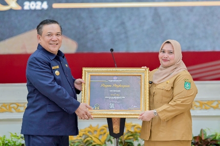 Penyerahan penghargaan tersebut dilakukan saat Pelaksanaan Rapat Koordinasi Daerah (Rakorda) Pelaksanaan Anggaran Pusat dan Daerah tahun 2024 yang dipusatkan di Balai Serindit Gedung Daerah Provinsi Riau.