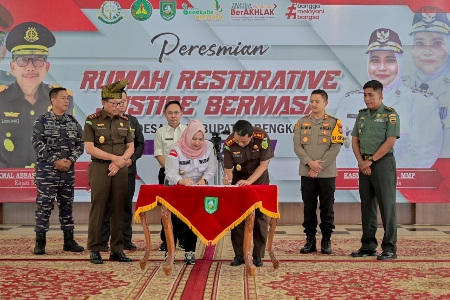 "Kami sangat mengapresiasi Pemerintah Kabupaten Bengkalis yang saat ini dipimpin Ibu Bupati Kasmarni, karena telah berkolaborasi cukup baik dengan Kejaksaan, sehingga telah membentuk Rumah Restorative Justice di seluruh desa. Rasanya baru kali ini ada di Indonesia dan ini harus kita jadikan percontohan. Karena yang saya tahu RRJ ini biasanya hanya dibuat di tingkat kecamatan, namun Kabupaten Bengkalis telah membentuk RRJ untuk seluruh desa," ujar Kajati Riau, Akmal Abbas ketika memberikan sambutan.