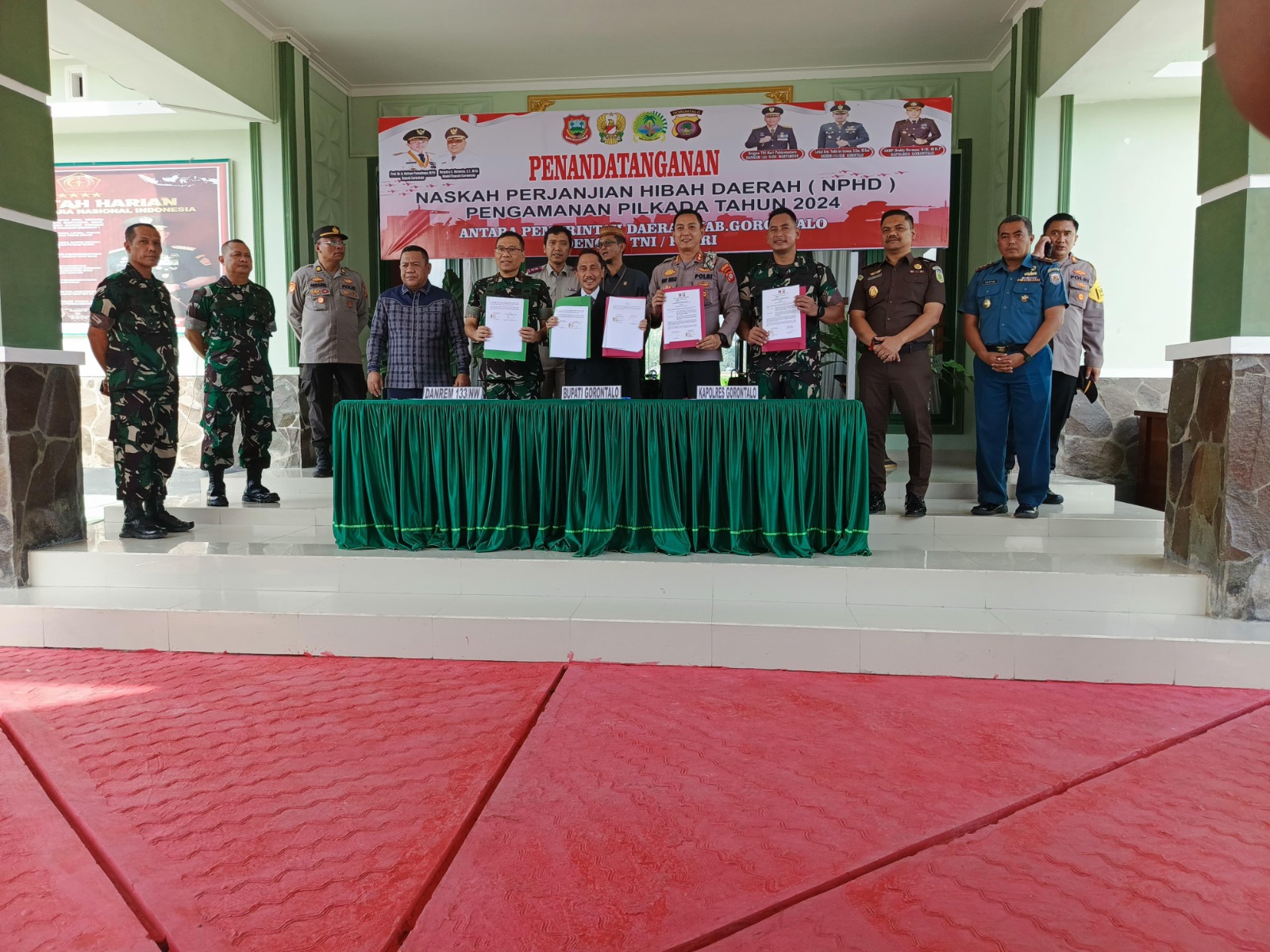 penandatanganan NPHD Pemerintah Daerah Kabupaten Gorontalo bersama Polres Gorontalo dan TNI tersebut, berlangsung di Makodim 1315 Kabupaten Gorontalo, yang dihadiri oleh Bupati Gorontalo Bapak Prof. DR. Nelson Pomalingo.,S.Pd., Danrem 133 NWB Brigjen TNI Hari Pahlawantoro.,S.Sos., Kasi Ter Korem 133/NW Kolonel Inf. Azhari. S.IP., Dandim 1315 Kab Gorontalo Letkol Arm. Yudi Ari Irawan.S.Sos.,M.Han., Kasi Ops Korem 133/NW Letkol Loka Jaya Sembada., Danlanal Gorontalo Letkol (P) Martha Novianto.,SH.,M.Tr. Opsla.CHRMP., Ketua DPRD Kab. Gorontalo Bapak Syam T. Ase, ST., Kajari Kabupaten Gorontalo Bapak Muh. Iqbal.,SH., Kepala Pengadilan Negeri Kab. Gorontalo Bapak Hendy Nurcahyo Saputra.,SH..MH., Kaban Kesbangpol Kab. Gorontalo Bapak Burhan Isa, SE, ME., Kabag Ops Polres Gorontalo AKP Akmal Novian Reza, SIK, dan Kabag Ren Polres Gorontalo AKP Yakob Abdul, SH.