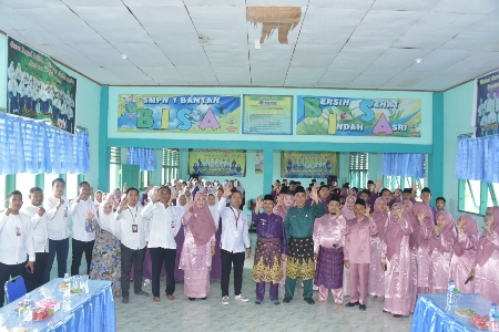 Kedatangan Wakil Bupati Bengkalis H. Bagus Santoso disambut hangat oleh Pimpinan BRK Syari'ah Cabang Kecamatan Bantan Nofri Suyono dan Kepala Sekolah SMP Negeri 1 Bantan Sri Rahayu beserta jajarannya. (Kmf/Mnc).