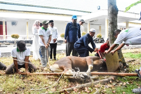 "Atas nama Pemerintah Kabupaten dan Ibu Bupati Kasmarni, mengucapkan selamat Hari Raya Idul Adha 1445 Hijriah. Semoga sapi kurban Pemerintah Kabupaten Bengkalis yang disalurkan melalui Baznas, dapat dirasakan manfaatnya oleh masyarakat kita," ujar Sekda Bengkalis, dr Ersan.