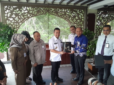 Di akhir pertemuan silaturahmi itu, Pj walikota menerima cinderamata dari pimpinan PT BRK Syariah. Penyerahan cinderamata berlangsung di luar ruangan pertemuan. (Kmf/Mnc).
