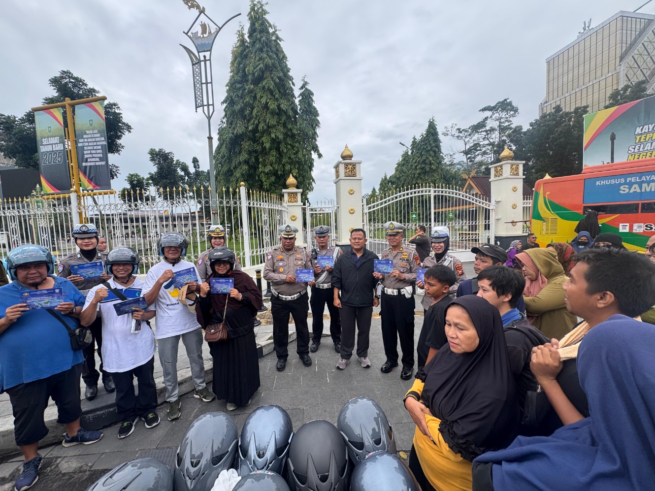 Sembari Olahraga Pagi Dirlantas Polda Riau Sapa Pengunjung CFD Pekanbaru & Bagikan Helm SNI