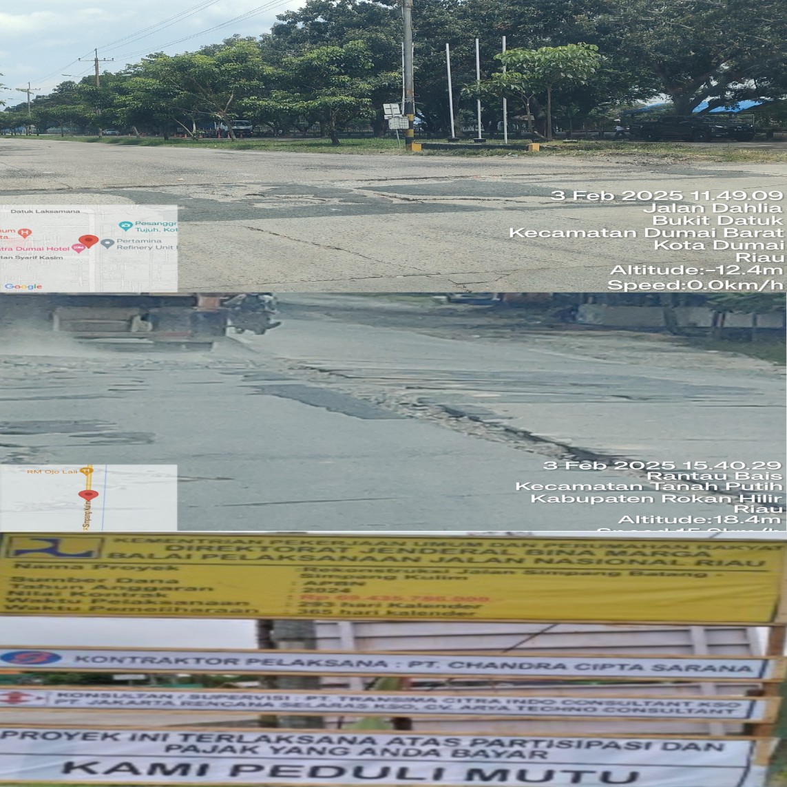 Pekerjaan Preservasi Rehabilitasi Jalan Sp. Batang–Sp.Kulim, Sp.Batang–Sp.Terminal dan Bts.Kota Dumai–Duri (MYC) yang itu,Jalan SH/PK kota Dumai sepanjang 27.240 M, jalan PT kota Dumai sepanjang 3.485 M, jalan DL kota Dumai sepanjang 2.800 M dan Sp.P S/d Sp.BT sepanjang 6.417 M, Sp.T S/d Sp.P Dumai sepanjang 1.740 M dan BTS.Kota Dumai Sp.T sepanjang 17.307 M diduga masih belum terlaksana kegiatan sesuai kontrak kerja yang telah ditentukan.