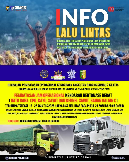 MafiNews.com, Pekanbaru – Dalam rangka mendukung kelancaran perhelatan Festival Pacu Jalur 2025 di Kabupaten Kuantan Singingi (Kuansing), seluruh pengemudi angkutan barang dengan sumbu dua ke atas diimbau untuk mematuhi aturan pembatasan jam operasional yang telah ditetapkan.