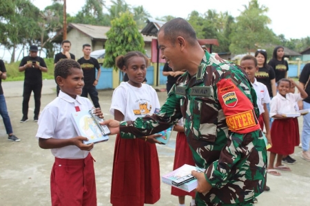 MafiNews.com, Satgas Yonif 132/BS Pos Kout bekerjasama dengan Horison Hotels Group memberikan bantuan bagi siswa SD Inpres Skouw Mabo yang bertempat Di Kp. Skouw Mabo, Distrik Muara Tami, Kota Jayapura, Provinsi Papua, Kamis (22/06/2023).