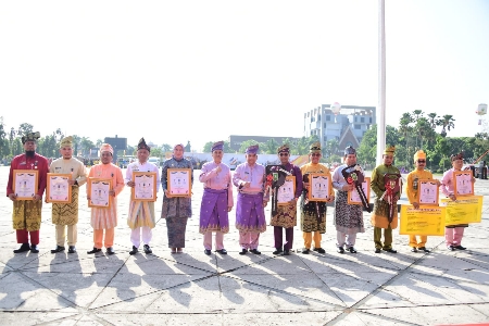 Usai pelaksanaan upacara, Gubernur Riau Syamsuar memasangkan lencana Wira Bagun Desa kepada Asisten 1 yang mewakili Bupati Kasmarni kala itu.