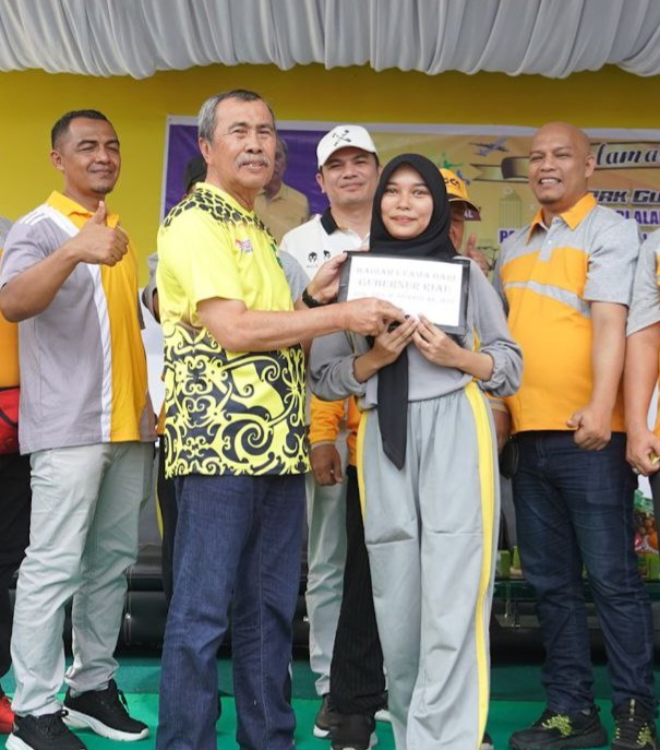 Dihadapan Gubernur Riau, siswa SMAN 8 Mandau ini terlihat mengusap air mata saat orang nomor satu di Riau itu menyerahkan kunci motor sebagai hadiah utama. Ia mengaku tidak menyangka bisa menerima hadiah dari acara jalan santai yang diikuti dengan semangat sehingga memperoleh hadiah utama.